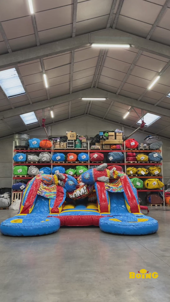 Ons Combo Midi 2 Glijbanen Comic Springkasteel is ideaal voor iedereen die een springkasteel zoekt dat plezier en beweging biedt. Dit unieke springkasteel combineert de actie van springen met de uitdaging van glijden. Het ontwerp is perfect voor binnen- en buitengebruik. Het heeft leuke obstakels en is geschikt voor kinderen van alle leeftijden.